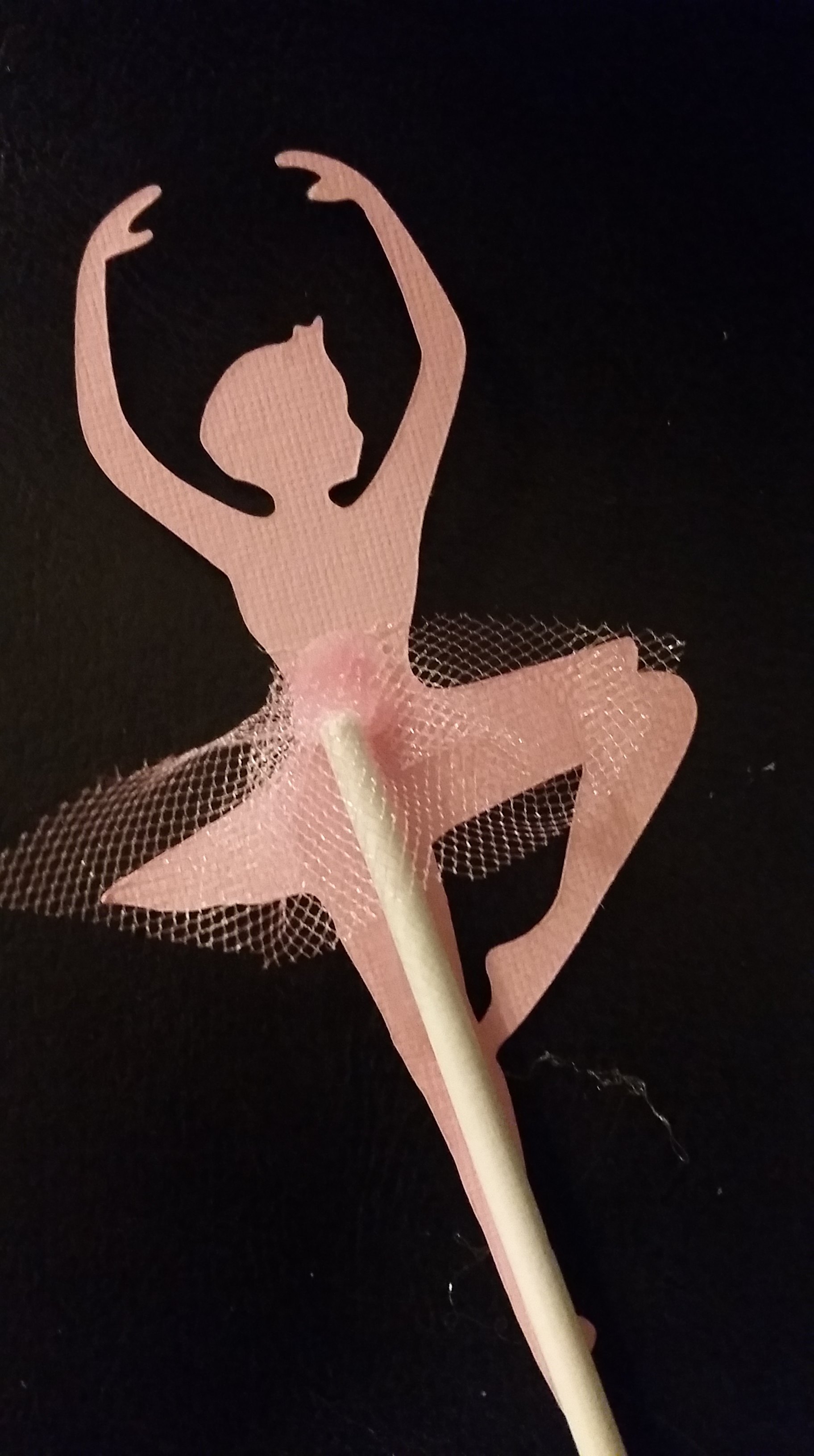 Once glued on, I then cut two little inch long strips of tulle. I placed a small dot of glue in the center of the figure’s waist (right where the top of the stick was). I secured each piece of tulle on the glue and then creased and folded it over until I had a tutu textured look. I overlapped the front and back piece to give it a more uniformed look. Lastly, I added another small dot of hot glue to the front for a rhinestone. After all, you can never have too much sparkle!