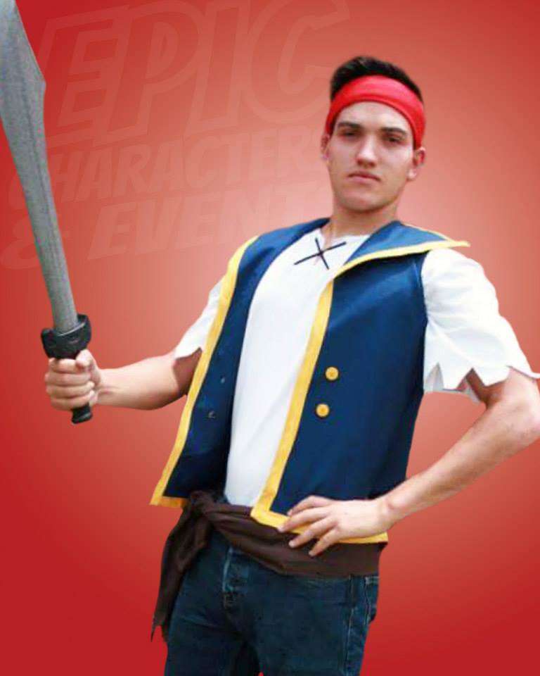 The red headband was also purchased from a second hand store. It was a cotton scarf that I cut and frayed the edges of to look pirate worthy. Lastly, the boot covers were purchased on Amazon for $15. The performer wore his own blue jeans and brown shoes to complete the outfit.