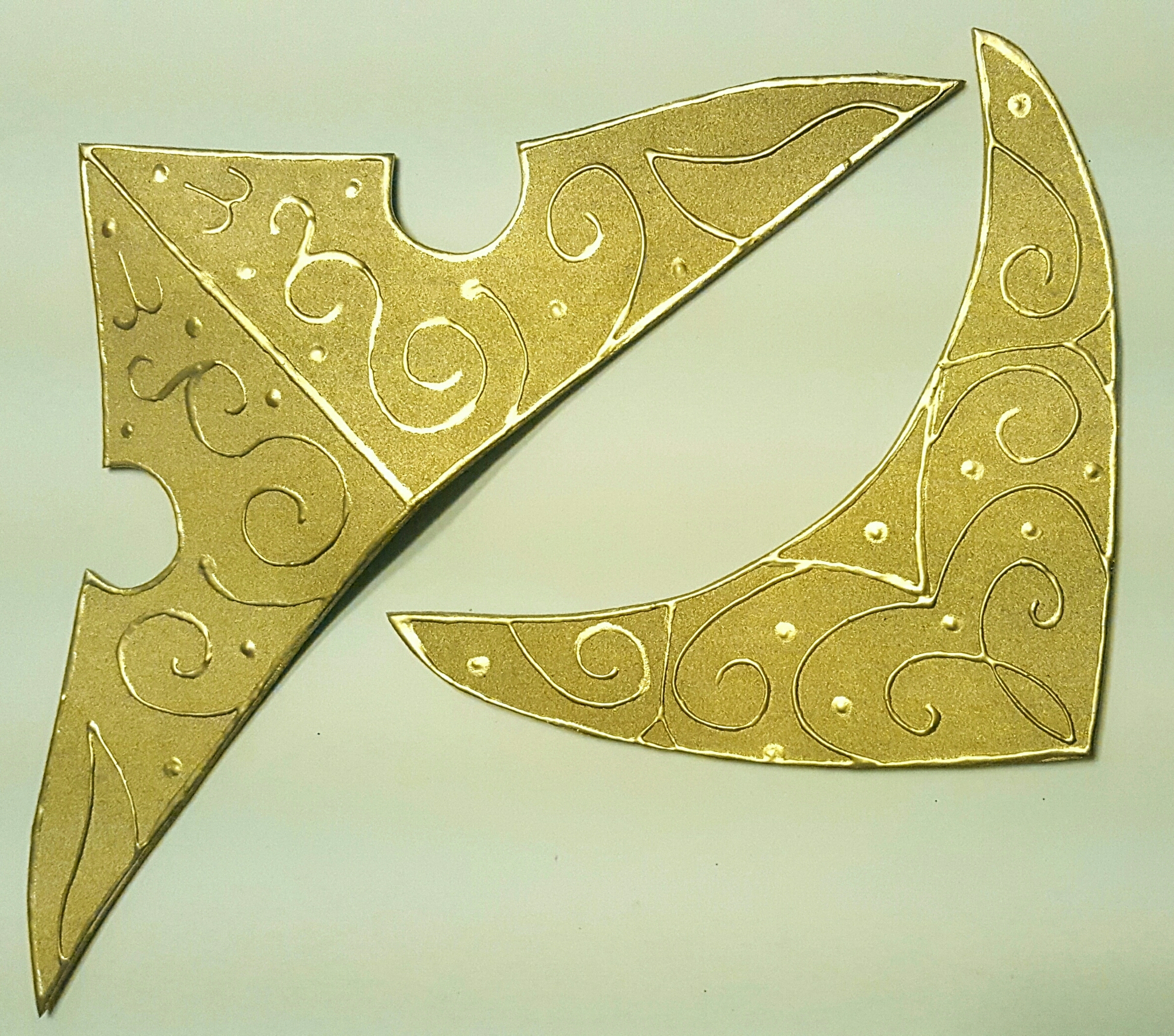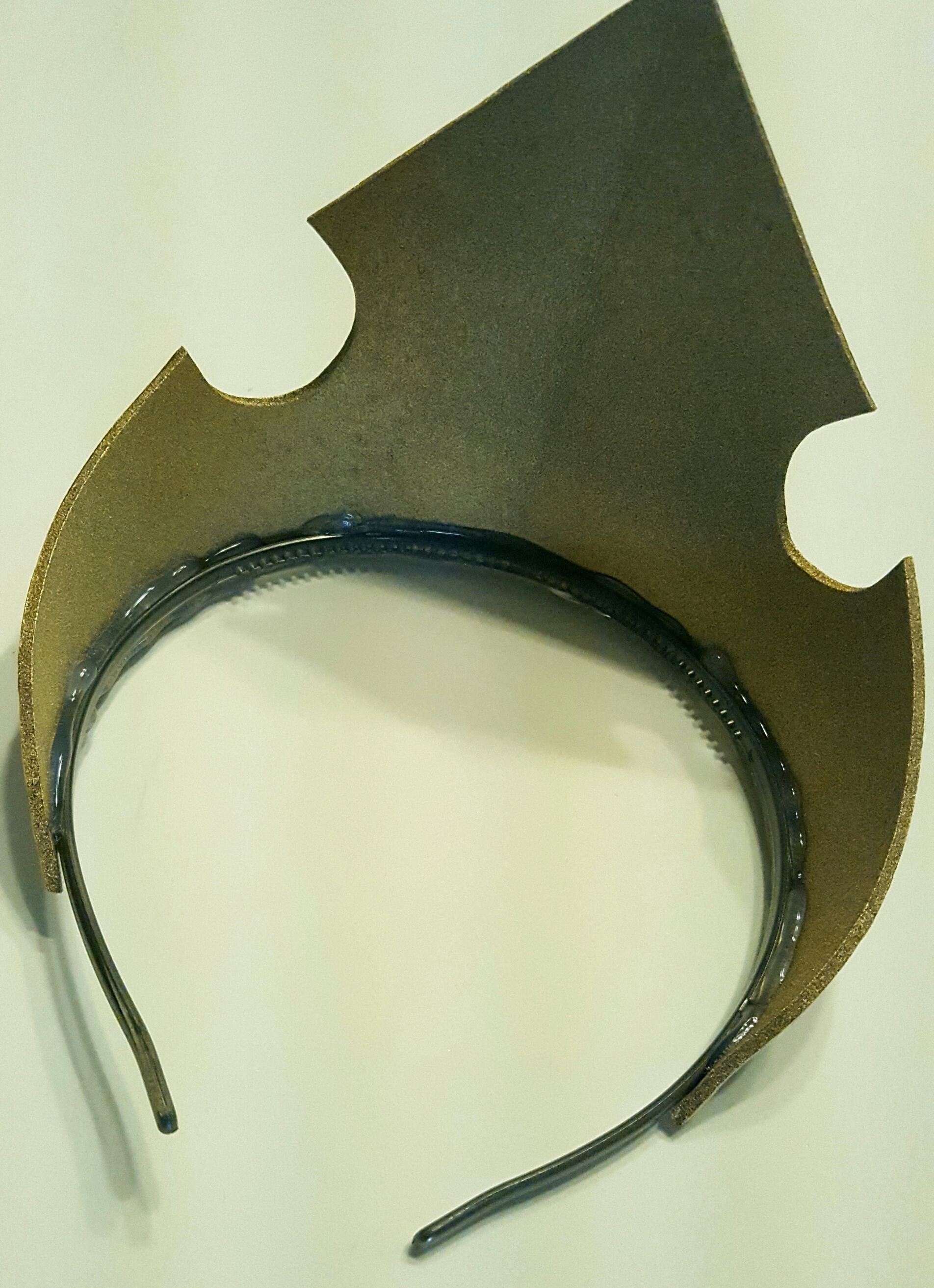 Let it dry for 24 hrs. Spray paint the front and back using metallic gold spray paint. At this point both pieces should be relatively flat, with the exception of the slight crease in the crown.