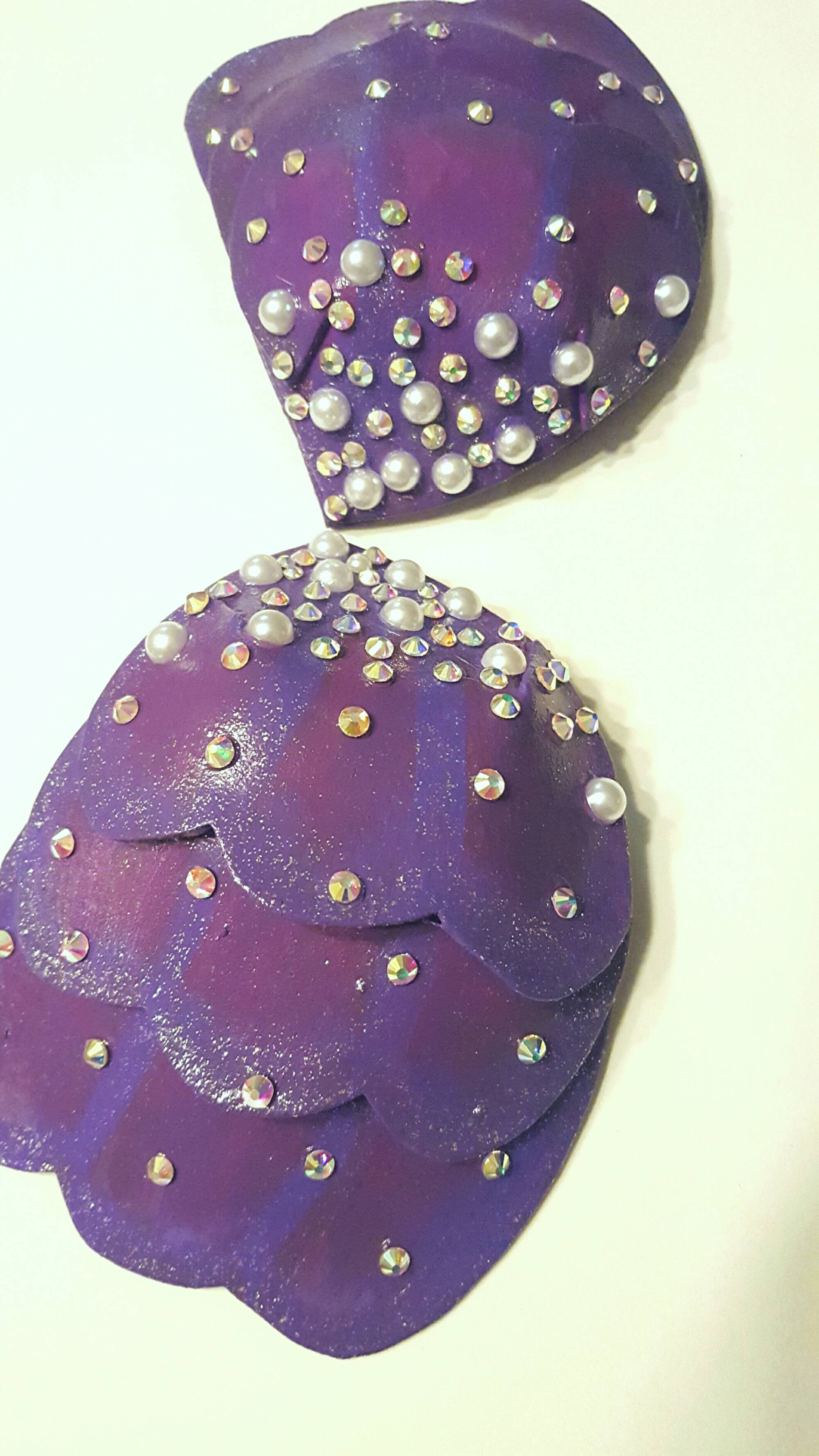 Finally, it’s time to attach the shells to the bra/bathing suit top. E6000 doesn’t dry instantly but has a strong hold. Hot glue dries quickly but can sometimes peel off. I used a mixture of the two to fix the shells to the bra top. I used E6000 toward the center of the shells and then hot glue around the outside to quickly secure the edges. I also went through with hot glue and added more pearls and rhinestones to the center of the bra top to give it a seamless look.